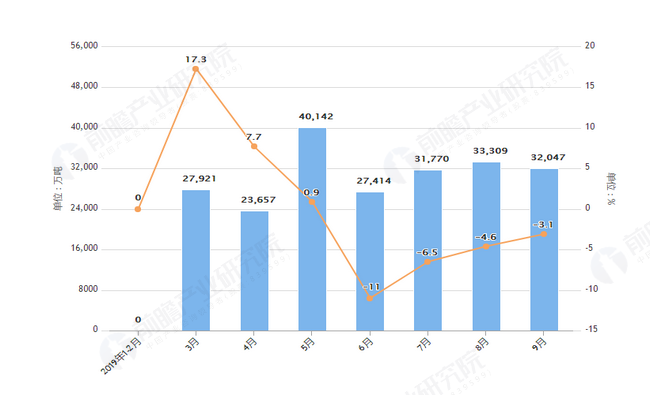 據(jù)國(guó)家統(tǒng)計(jì)局統(tǒng)計(jì)數(shù)據(jù)顯示,2019年8月中國(guó)大氣污染防護(hù)設(shè)備產(chǎn)量為33309萬(wàn)噸,同比下降4.6%,2019年9月中國(guó)大氣污染防護(hù)設(shè)備產(chǎn)量為32047套,同比下降3.1%,2019年1-9月中國(guó)大氣污染防護(hù)產(chǎn)量為351097套,累計(jì)下降7%。