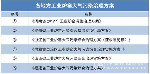 由此可見,我國工業(yè)爐窯污染物排放標(biāo)準(zhǔn)正趨于精細(xì)化。加快推動工業(yè)爐窯大氣污染綜合治理隨之被提到日程中來。2019年7月,生態(tài)環(huán)境部等4部委聯(lián)合下發(fā)《工業(yè)爐窯大氣污染綜合治理方案》,時間節(jié)點確定為2020年,由此,各地方與工業(yè)爐窯的“攻堅戰(zhàn)”序幕拉開。具體如下表: