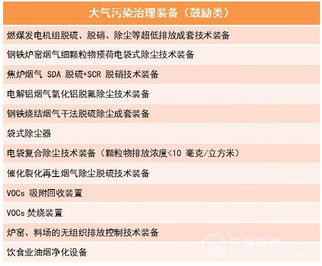 值得注意的是,《目錄》中將所鼓勵(lì)的“大氣污染治理裝備”自成一小節(jié),包括脫硫脫硝設(shè)備、除塵設(shè)備、無組織排放控制設(shè)備、油煙凈化設(shè)備等10余項(xiàng)。由此可見,環(huán)保未來將成為企業(yè)長(zhǎng)久發(fā)展的一個(gè)戰(zhàn)略。具體鼓勵(lì)裝備如下: