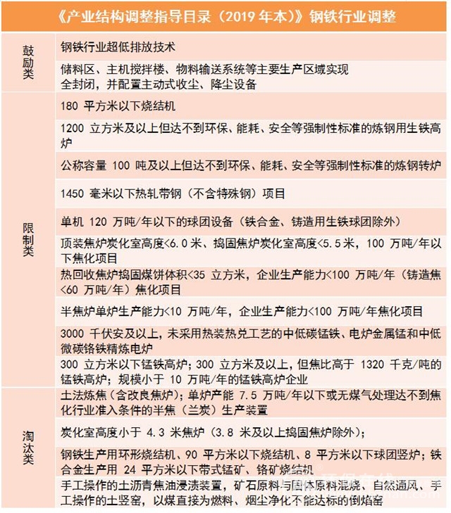 根據(jù)我國(guó)大氣污染的實(shí)際情況,《目錄》對(duì)煤炭燃燒和鋼鐵兩個(gè)行業(yè)的調(diào)整力度也相對(duì)較大。鋼鐵超低排放方面,迎合國(guó)家政策,鼓勵(lì)新技術(shù)的開發(fā)與應(yīng)用,要求生產(chǎn)過程中實(shí)現(xiàn)全封閉,采用除塵等設(shè)備,鼓勵(lì)使用更清潔的生產(chǎn)工具,淘汰或關(guān)停高度低、污染中的焦?fàn)t等;