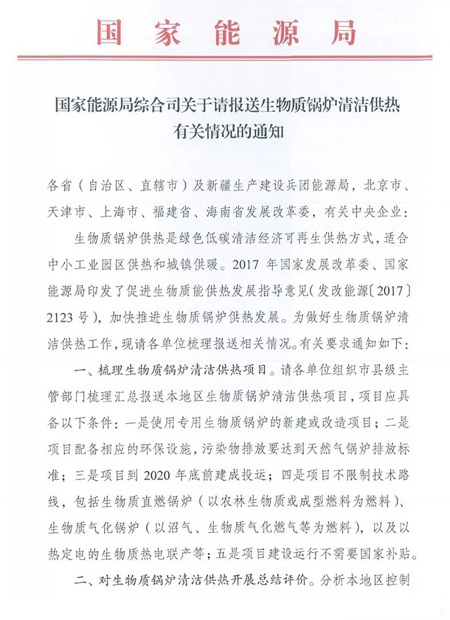 近日,國(guó)家能源局下發(fā)《國(guó)家能源局綜合司關(guān)于請(qǐng)報(bào)送生物質(zhì)鍋爐清潔供熱有關(guān)情況的通知》(以下簡(jiǎn)稱(chēng)《通知》),要求各地方能源局、發(fā)改委、有關(guān)中央企業(yè)報(bào)送生物質(zhì)鍋爐清潔供熱相關(guān)情況。