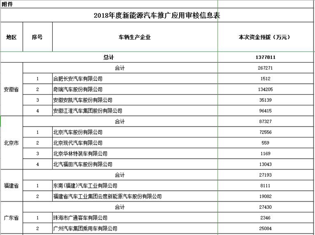 近日,工信部裝備工業(yè)司發(fā)布了《關(guān)于2018年度推廣應(yīng)用新能源汽車補(bǔ)助資金預(yù)撥審核情況的公示》,具體如下: