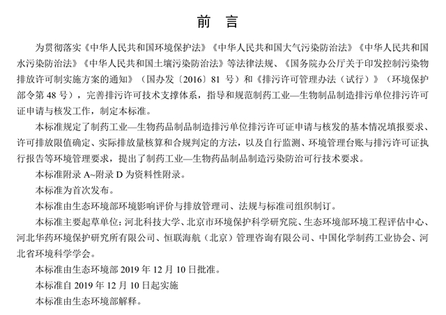 為貫徹落實(shí)《中華人民共和國環(huán)境保護(hù)法》《中華人民共和國大氣污染防治法》《中華人民共和國水污染防治法》《中華人民共和國土壤污染防治法》等法律法規(guī)、《國務(wù)院辦公廳關(guān)于印發(fā)控制污染物排放許可制實(shí)施方案的通知》(國辦發(fā)〔2016〕81號(hào))和《排污許可管理辦法(試行)》(環(huán)境保護(hù)部令第48號(hào)),完善排污許可技術(shù)支撐體系,指導(dǎo)和規(guī)范制藥工業(yè)—生物制品制造排污單位排污許可證申請(qǐng)與核發(fā)工作,制定本標(biāo)準(zhǔn)。