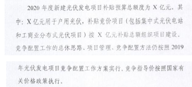 《通知》的一大亮點就是“2020年度新建光伏發(fā)電項目補(bǔ)貼預(yù)算總額度為X億元,其中戶用光伏X億元,競價項目X億元”,這是因為財政部、國家發(fā)改委價格司仍未確定2020年光伏補(bǔ)貼總額度以及指導(dǎo)電價,因此負(fù)責(zé)制定管理辦法的國家能源局也無法給出明確數(shù)額,指導(dǎo)價也處于待定狀態(tài)。