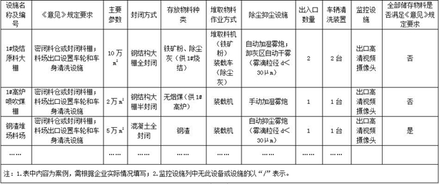 3.物料封閉儲存源清單。各封閉儲存設(shè)施分別建立清單,明確儲存面積、封閉方式、存放物料種類、堆取料作業(yè)方式、治理和監(jiān)控設(shè)施、主要出入口數(shù)量及配套車輛清洗裝置情況等。