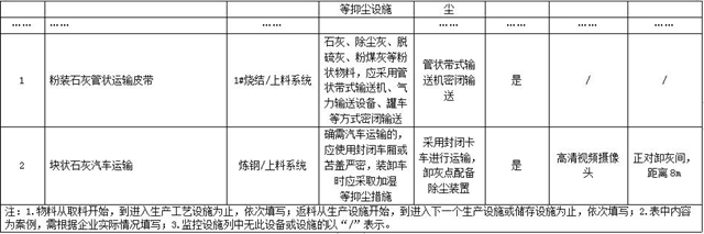 應(yīng)按照《意見》要求,對全廠無組織排放源進行全面排查,按照生產(chǎn)工藝過程、物料密閉儲存、物料密閉輸送、物料封閉儲存、物料封閉運輸五個方面分別建立全覆蓋的無組織排放源清單。無組織排放源清單至少每年更新一次。附表2-附表5為無組織排放源清單示例,可作為企業(yè)建立無組織清單的參考。