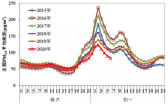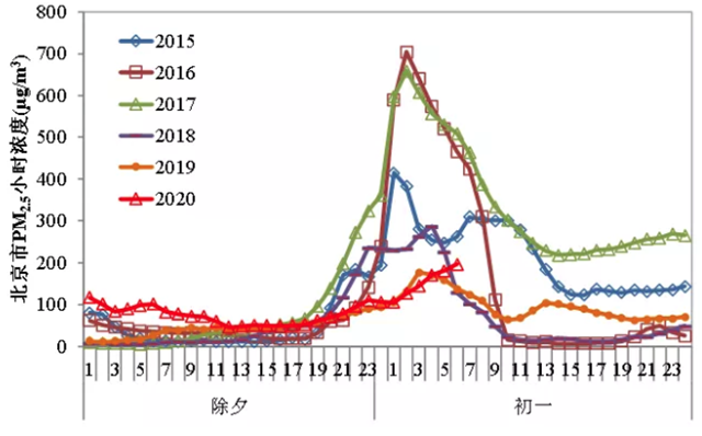 2020年春節(jié)期間北京市五環(huán)內(nèi)禁放煙花爆竹,與2015至2018年春節(jié)期間相比,北京市污染程度明顯減輕,與2019年春節(jié)期間基本持平,最大峰值濃度為197微克/立方米,較去年同期上升11.3%(去年同期峰值為177微克/立方米),較三年平均峰值濃度下降47.3%。初一凌晨4時至6時PM2.5小時濃度超過150微克/立方米,空氣質(zhì)量達(dá)重度污染,未出現(xiàn)嚴(yán)重污染,相比近三年春節(jié)期間,重度及以上污染時長已顯著降低。