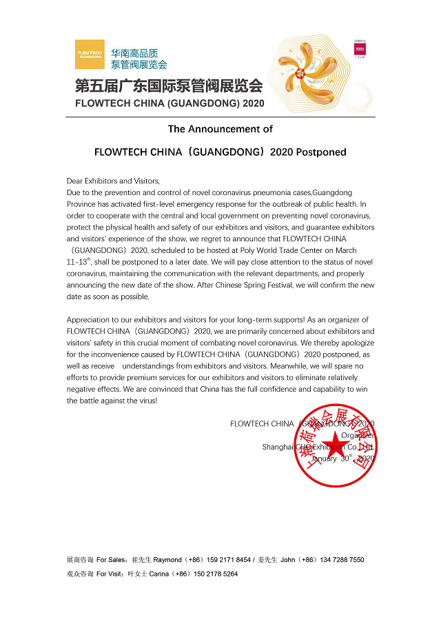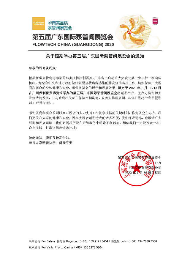 鑒于目前我國(guó)新型冠狀病毒感染肺炎疫情防治面臨嚴(yán)峻形勢(shì),為配合打贏疫情防御防控阻擊戰(zhàn),切實(shí)保障廣大展商、參會(huì)人員和觀眾的身體健康和生命安全,根據(jù)廣東省防控新型冠狀病毒感染的肺炎疫情工作領(lǐng)導(dǎo)小組辦公室《關(guān)于限制群眾性活動(dòng)的通知》、廣東省商務(wù)廳《關(guān)于暫停大型經(jīng)貿(mào)活動(dòng)的緊急通知》和廣州市商務(wù)局《關(guān)于暫停全市大型展覽活動(dòng)的通知》中有關(guān)疫情防控期間暫停一切大型經(jīng)貿(mào)展覽活動(dòng)的通知精神,切實(shí)保障所有參展人員的身體健康和生命安全,第五屆廣東國(guó)際泵管閥展覽會(huì)主辦方積極響應(yīng)國(guó)家防疫政策,將原定于2020年3月11-13日在廣州保利世貿(mào)博覽館舉辦的第五屆廣東國(guó)際泵管閥展覽會(huì)延期舉辦,具體舉辦時(shí)間將另行通知。