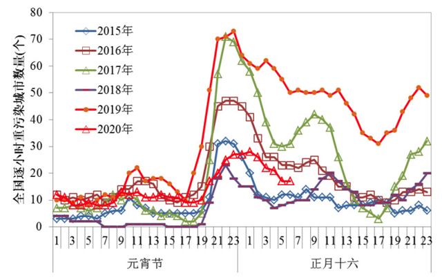 從近六年元宵節(jié)夜間全國城市環(huán)境空氣質(zhì)量變化情況來看,2020年元宵節(jié)期間全國337個城市空氣質(zhì)量總體優(yōu)于歷史同期,PM2.5最大小時平均濃度較去年元宵節(jié)最大值下降了33%,較三年最大值的平均值下降了31%。峰值污染期間全國重污染城市數(shù)量較去年同期減少了46個,較三年平均重污染城市數(shù)減少了29個。