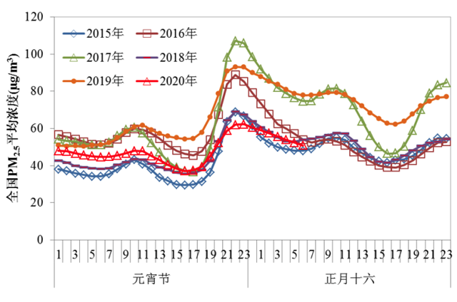 圖2近六年元宵節(jié)期間全國逐小時PM2.5平均濃度