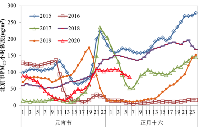 2020年春節(jié)期間北京市五環(huán)內(nèi)禁放煙花爆竹,但受到非禁放區(qū)煙花爆竹燃放影響,元宵節(jié)夜間19時起PM2.5濃度快速上升,21時達(dá)到峰值濃度109微克/立方米,此后在不利氣象條件下繼續(xù)維持較高濃度。與歷史同期相比,今年北京市污染程度有所減輕,峰值濃度較去年同期下降37%,較三年平均峰值濃度下降23%,未出現(xiàn)小時重度及以上污染。