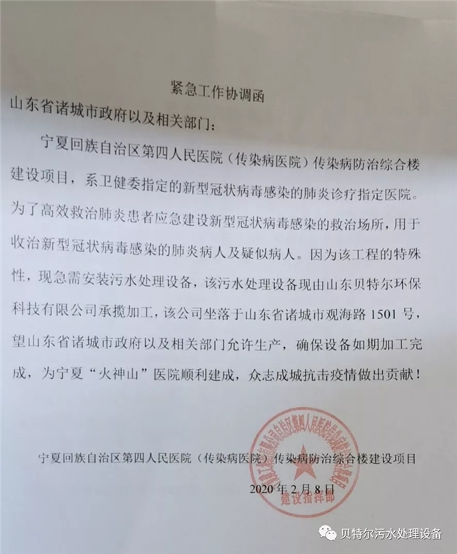 2019年底,臨近春節(jié),當(dāng)全國(guó)人民沉浸在節(jié)日的祥和中時(shí),一場(chǎng)突如其來(lái)來(lái)的疫情蔓延開(kāi)來(lái),陰云籠罩在神州大地。武漢告急!湖北告急!全國(guó)進(jìn)入一級(jí)響應(yīng),各地紛紛伸出援手,一時(shí)間,應(yīng)急物資源源不斷的運(yùn)往武漢。疫情就是命令,作為一家以致力于環(huán)保事業(yè)的企業(yè),山東貝特爾環(huán)??萍加邢薰靖橇x不容辭,全員一心,共克時(shí)艱,為緩解疫情肆虐下醫(yī)院污水處理的巨大壓力,積極準(zhǔn)備制作醫(yī)院污水處理設(shè)備。在接到寧夏回族自治區(qū)第四醫(yī)院(傳染病醫(yī)院)的求助信函時(shí),第一時(shí)間組織員工,加班加點(diǎn)為寧夏第四醫(yī)院趕制兩套醫(yī)院污水處理設(shè)備,并于2月11日連夜運(yùn)往寧夏,為寧夏“火神山”醫(yī)院順利建成,眾志成城抗擊疫情做出貢獻(xiàn)!中國(guó)加油!