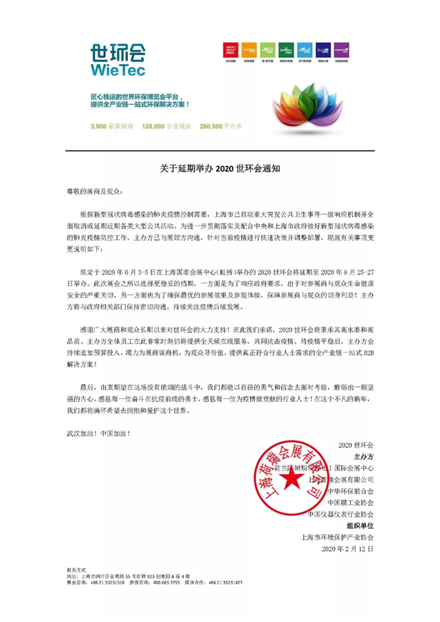 為進一步貫徹落實及配合中央和上海市政府做好新型冠狀病毒感染的肺炎疫情防控工作,切實保障參展商與觀眾生命健康安全及切身利益,確保參展效果及參觀體驗,主辦方響應(yīng)政府號召,在春節(jié)期間已與展館方溝通,針對當(dāng)前疫情進行快速決策及調(diào)整部署,選擇更穩(wěn)妥的檔期,將原定于2020年6月3-5日在上海國家會展中心(虹橋)舉辦的2020世環(huán)會延期至2020年8月25-27日舉辦。