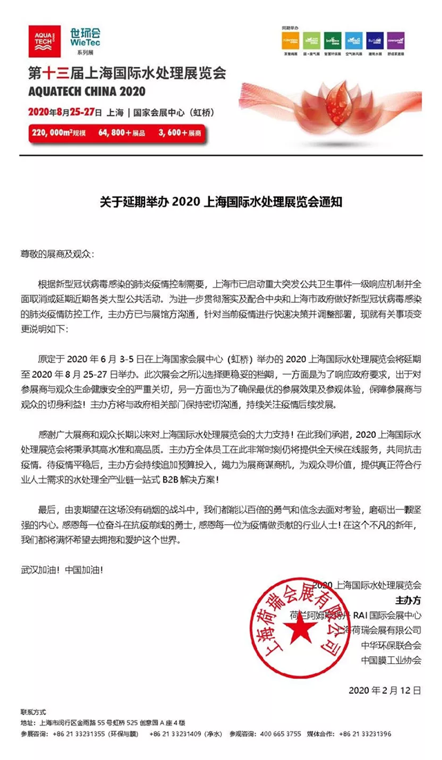 為全力支持打贏疫情防控阻擊戰(zhàn),貫徹落實上海市疫情防控工作領導小組的防疫工作指導方針,切實保障廣大展商和觀眾的身體健康和安全,確保展覽會的展示和觀展效果,原定于 2020 年 6月 3-5 日在上海國家會展中心(虹橋)舉辦的2020上海國際水處理展覽會將延期至2020年8月25-27日舉辦。主辦方將與政府相關部門保持密切溝通,持續(xù)關注疫情后續(xù)發(fā)展。