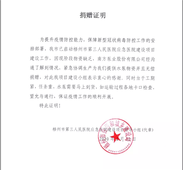 同時(shí),2月中下旬,梧州市啟動(dòng)第三人民醫(yī)院應(yīng)急醫(yī)院建設(shè)項(xiàng)目建設(shè)工作,因現(xiàn)階段物資缺乏,南方泵業(yè)股份有限公司經(jīng)溝通了解到情況后,緊急協(xié)調(diào)生產(chǎn)為醫(yī)院提供水泵物資并且無償捐贈(zèng),由于工期緊,任務(wù)重,南方泵業(yè)積極協(xié)調(diào)生產(chǎn)及運(yùn)輸,確保物資準(zhǔn)時(shí)到位,保障醫(yī)院建設(shè)工作,保證疫情工作的順利開展。
