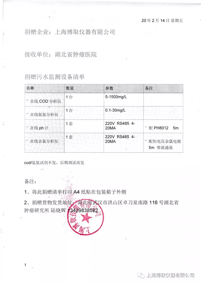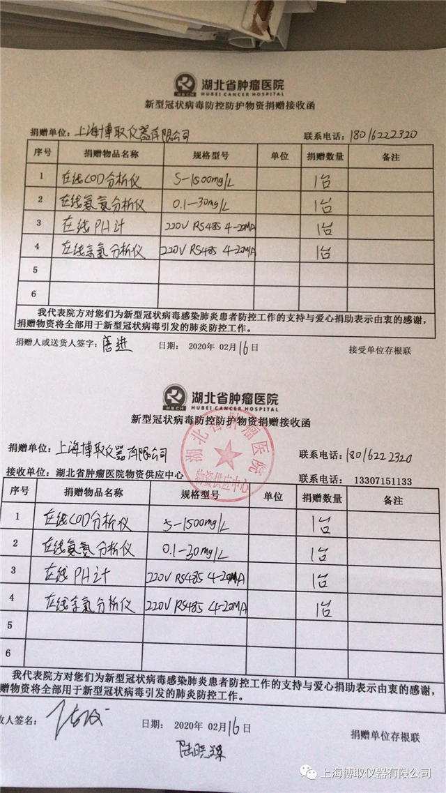 為更好地讓武漢當(dāng)?shù)蒯t(yī)院救治更多的患者,確保疫情消滅成果,堅(jiān)決打贏疫情防控阻擊戰(zhàn),上海博取儀器有限公司決定為湖北省腫瘤醫(yī)院捐贈(zèng)一批水質(zhì)監(jiān)測儀器儀表,在線COD分析儀、在線氨氮分析儀、在線PH計(jì)、在線余氯,作為一個(gè)有社會(huì)責(zé)任感的企業(yè),上海博取儀器堅(jiān)決跟隨國家腳步抗擊此次疫情,為了能讓武漢重見光明,也盡一份綿薄之力。