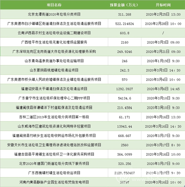 2020年2月,環(huán)保的小馬達(dá)還是要發(fā)動(dòng)的。關(guān)于“垃圾”服務(wù)的相關(guān)招標(biāo),本文帶你逛一逛。
