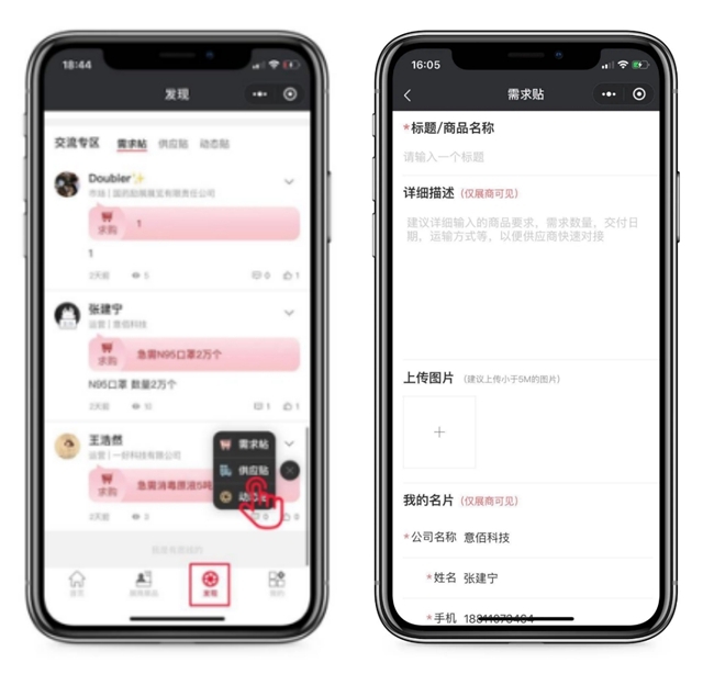 02點擊“發(fā)現(xiàn)”—發(fā)帖,選擇發(fā)帖類型,發(fā)布供需信息