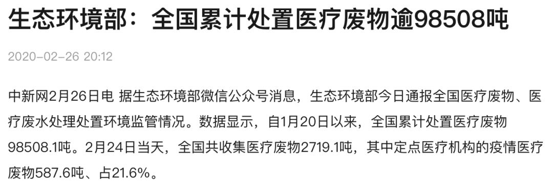 據(jù)生態(tài)環(huán)境部微信公眾號(hào)消息,自1月20日以來(lái),全國(guó)累計(jì)處置醫(yī)療廢物已經(jīng)超過(guò)了98508噸。