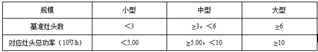 4.1.1餐飲服務(wù)單位規(guī)模按照基準(zhǔn)灶頭數(shù)劃分為大型和中小型。基準(zhǔn)灶頭數(shù)按灶的總發(fā)熱功率折算,每個基準(zhǔn)灶頭對應(yīng)的發(fā)熱功率為1.67×108J/h。餐飲服務(wù)單位的規(guī)模劃分參數(shù)見表1。