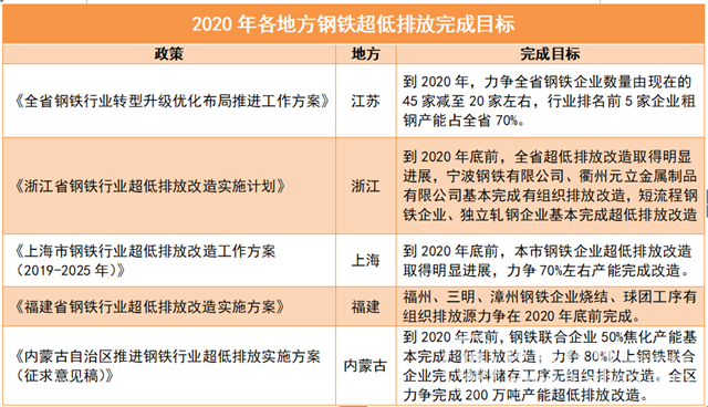 根據(jù)2019年印發(fā)的《關(guān)于推進(jìn)實(shí)施鋼鐵行業(yè)超低排放的意見》可知,到2020年,重點(diǎn)區(qū)域鋼企超低排放改造要力爭完成60%左右。在此推動(dòng)下,山東、江蘇、浙江、福建等多個(gè)地方積極響應(yīng),相繼發(fā)布的相關(guān)的政策或排放標(biāo)準(zhǔn),促進(jìn)鋼鐵企業(yè)綠色生產(chǎn)。