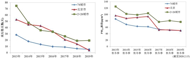 全國(guó)74城市、“2+26”城市和北京市重污染超標(biāo)天和秋冬季PM2.5濃度的變化