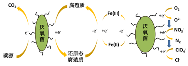 利用醌類物質(zhì)及其聯(lián)合氧化鐵的電子穿梭作用和腐殖質(zhì)中醌類結構大量存在的特點,通過在厭氧生物體系中加入腐殖質(zhì)或者同時加入腐殖質(zhì)和氧化鐵,促進體系中的電子傳遞效率,達到顯著提升高氯酸鹽/硝酸鹽還原效率的效果。
