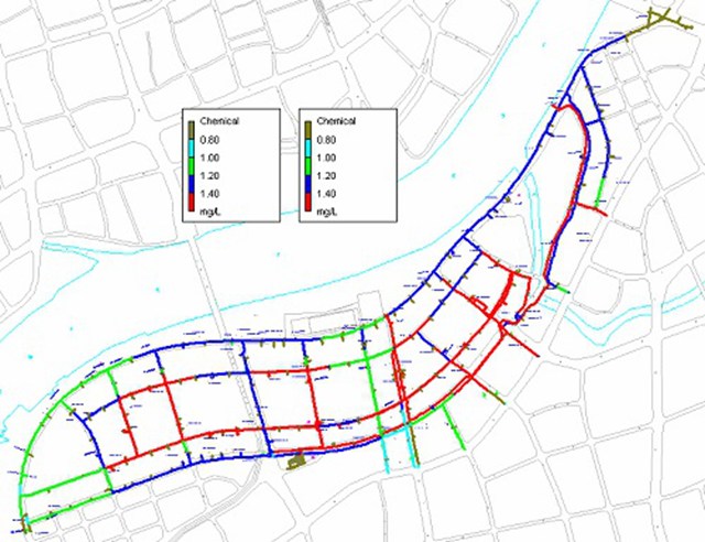 管網(wǎng)多級消毒、縱向水平衡漏損控制、管網(wǎng)水質(zhì)模擬等技術,實現(xiàn)了管網(wǎng)水力水質(zhì)動態(tài)模擬,為供水管網(wǎng)安全提供保障。團隊還利用