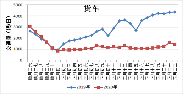 2019、2020年春節(jié)期間斷面交通量變化趨勢(數(shù)據(jù)來源:交通運輸部規(guī)劃院)