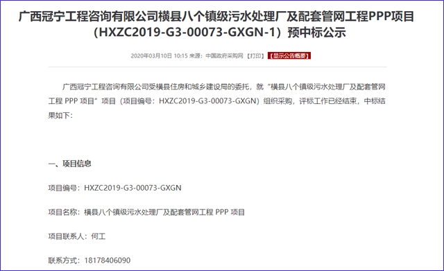 基于1.44元/噸運營水價、7.52%年投資收益率、0.50%建筑安裝工程下浮率,源自中國政府采購網(wǎng)日前報道稱,橫縣八個鎮(zhèn)級污水處理廠及配套管網(wǎng)工程 PPP 項目(編號:HXZC2019-G3-00073-GXGN)將由廣西環(huán)保產(chǎn)業(yè)投資集團有限公司和航天凱天環(huán)??萍脊煞萦邢薰镜穆?lián)合體斬獲。