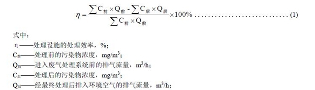 4.1.6 處理效率,指污染物控制設(shè)施去除污染物的量與處理前污染物的量之比,可通過同時(shí)測(cè)定處理前后廢氣中污染物的排放濃度和排氣量,以被去除的污染物與處理之前的污染物的質(zhì)量百分比計(jì),具體見(1)。