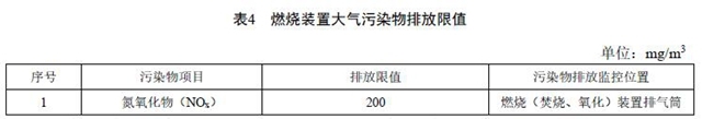4.1.10 VOCs燃燒(焚燒、熱氧化)裝置除滿足表1、表3的大氣污染物排放要求外,還需要對(duì)排放煙氣中的氮氧化物進(jìn)行控制,且應(yīng)符合表4規(guī)定的限值要求。利用鍋爐、固廢焚燒爐焚燒處理有機(jī)廢氣的,還應(yīng)滿足相應(yīng)排放標(biāo)準(zhǔn)的控制要求。