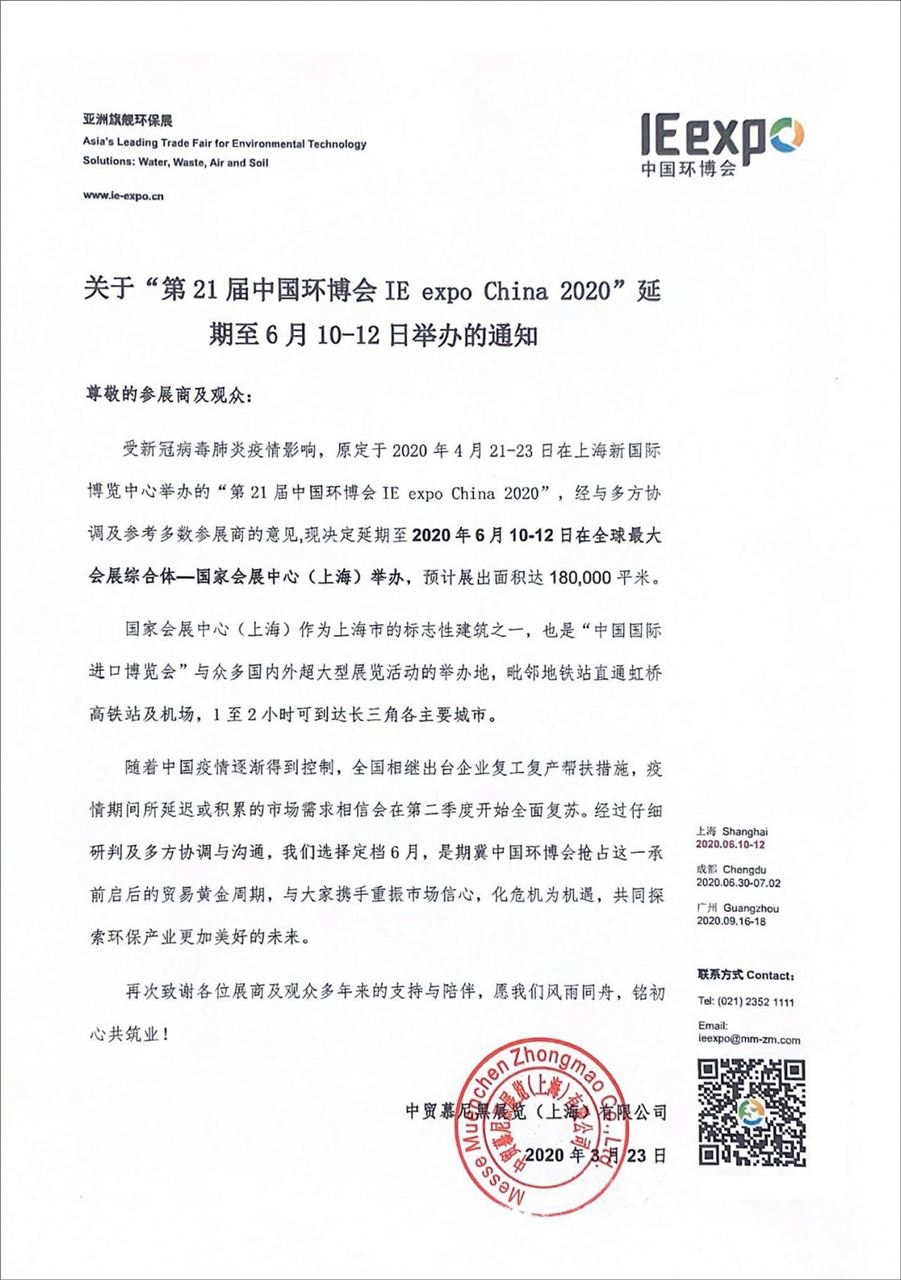 3月23日,中國(guó)環(huán)博會(huì)主辦方宣布,第21屆中國(guó)環(huán)博會(huì)IE expo China 2020延期至2020年6月10-12日移師國(guó)家會(huì)展中心(上海)舉辦,預(yù)計(jì)以18萬(wàn)平方米的展會(huì)面積,全力為環(huán)保產(chǎn)業(yè)奉獻(xiàn)一場(chǎng)保障安全、富有成效、占得先機(jī)的交流盛會(huì) !