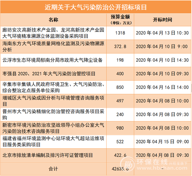 從中國政府采購網(wǎng)得知,近期關(guān)于大氣污染防治招標的項目有10個,均為2020年4月份開標,總金額達42635.6萬元,包括除塵設(shè)備、在線監(jiān)測系統(tǒng)、污染源探究等方面,具體如下: