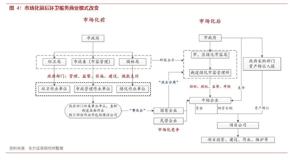 傳統(tǒng)環(huán)衛(wèi)作為一項(xiàng)公共事業(yè),一直由政府部門(mén)和下屬事業(yè)單位承擔(dān)著所有的管理、規(guī)劃、實(shí)施、監(jiān)督的工作,為政府壟斷產(chǎn)業(yè)。最初與外部市場(chǎng)主體的合作僅限于設(shè)備采購(gòu)和施工采購(gòu),運(yùn)營(yíng)管理責(zé)任由政府企事業(yè)單位承擔(dān)。長(zhǎng)久下來(lái),國(guó)有體制給環(huán)衛(wèi)服務(wù)行業(yè)的發(fā)展帶來(lái)了諸多問(wèn)題:“政企不分”、“管干合一”導(dǎo)致企業(yè)運(yùn)營(yíng)效率低和缺乏競(jìng)爭(zhēng)、無(wú)法滿足快速城鎮(zhèn)化帶來(lái)的工作量增長(zhǎng),最終體現(xiàn)在環(huán)衛(wèi)服務(wù)質(zhì)量差,這就要求行業(yè)加速推進(jìn)市場(chǎng)化。