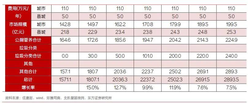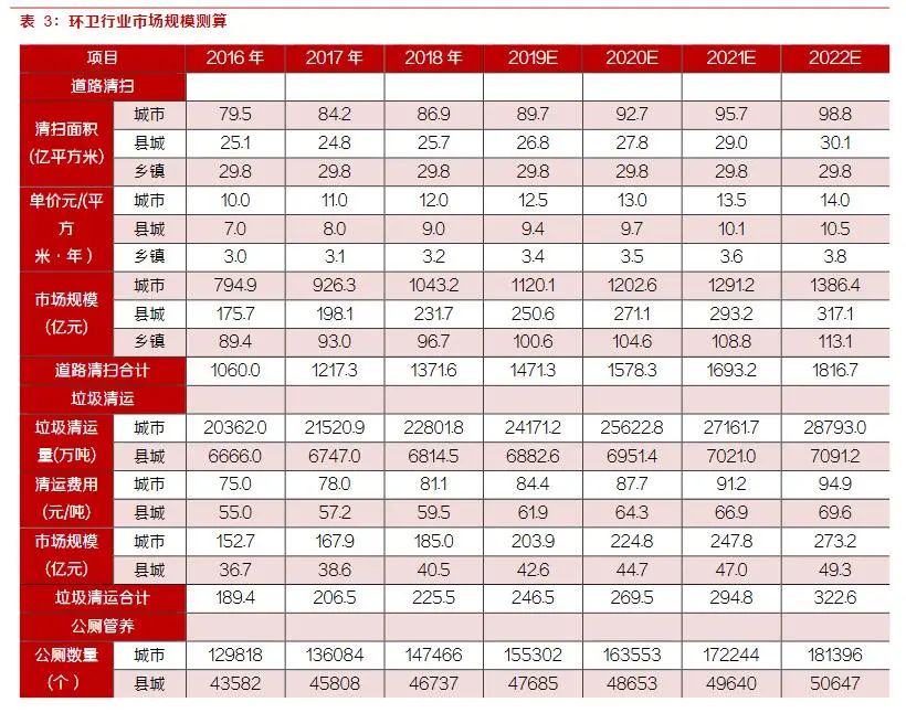 垃圾清運(yùn)層面,根據(jù)住建部統(tǒng)計(jì),2018年城市垃圾清運(yùn)量為2.28億噸,按目前市場(chǎng)情況,假設(shè)垃圾轉(zhuǎn)運(yùn)費(fèi)用城市為80元/噸,縣城為60元/噸,假設(shè)增長(zhǎng)率與道路清掃相同均為4%,目前總規(guī)模在240億元左右。公廁管養(yǎng)方面,假設(shè)城市與縣城公廁數(shù)量的增長(zhǎng)維持過(guò)去三年的平均增長(zhǎng)率,管養(yǎng)費(fèi)用城市為11萬(wàn)元/年,縣城為5萬(wàn)元/年,則公廁管養(yǎng)費(fèi)用合計(jì)190億元左右。