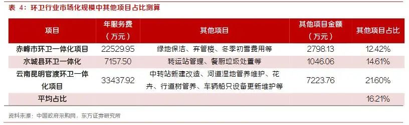 我們分別選取北京環(huán)境中標(biāo)的赤峰市環(huán)衛(wèi)一體化項(xiàng)目、龍馬環(huán)衛(wèi)中標(biāo)的水城縣環(huán)衛(wèi)一體化項(xiàng)目以及僑銀環(huán)保中標(biāo)的云南昆明官渡環(huán)衛(wèi)一體化項(xiàng)目三個(gè)具有代表性的環(huán)衛(wèi)一體化項(xiàng)目,測(cè)算其中除前述環(huán)衛(wèi)項(xiàng)目外其他項(xiàng)目所占比例。根據(jù)各項(xiàng)目合同中列示的作業(yè)項(xiàng)目工作量及單價(jià)計(jì)算可得前述項(xiàng)目金額,總服務(wù)費(fèi)減去前述項(xiàng)目服務(wù)費(fèi)得到其他項(xiàng)目金額??紤]云南昆明官渡環(huán)衛(wèi)一體化項(xiàng)目總金額達(dá)67億元,體量較大所以包含服務(wù)范圍相對(duì)更廣,故假設(shè)市場(chǎng)化合同中其他項(xiàng)目所占比例略低于平均值即15%左右。