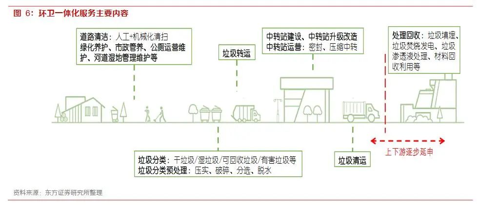 環(huán)衛(wèi)業(yè)務(wù)環(huán)節(jié)的一體化指的是服務(wù)內(nèi)容的增加以及產(chǎn)業(yè)上下游鏈條的多維度整合。具體來(lái)說(shuō),即環(huán)衛(wèi)項(xiàng)目突破傳統(tǒng)意義上的清掃保潔、垃圾清運(yùn),將清掃、保潔、中轉(zhuǎn)、收運(yùn)、處理進(jìn)行一體化打包,同時(shí)涉及垃圾分類、餐廚垃圾收運(yùn)處理、綠化養(yǎng)護(hù)、市政管養(yǎng)等內(nèi)容,隨著未來(lái)人們對(duì)生活環(huán)境要求的不斷提高,將會(huì)不斷納入新的服務(wù)項(xiàng)目。