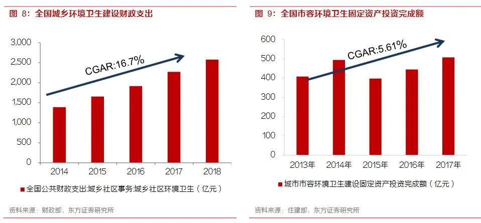 環(huán)衛(wèi)行業(yè)的收入來(lái)自于地方政府的環(huán)境衛(wèi)生建設(shè)的財(cái)政支出,2018年城鄉(xiāng)環(huán)境衛(wèi)生建設(shè)的財(cái)政支出達(dá)到2500億元,且過(guò)去三年保持16.7%左右的復(fù)合增速。城鎮(zhèn)化進(jìn)程的深入,城市邊界的的延伸,城市垃圾清運(yùn)和道路清掃的工作量會(huì)持續(xù)增長(zhǎng),環(huán)保要求的提高則推動(dòng)了處理單價(jià)上漲,行業(yè)正在經(jīng)歷量和價(jià)值雙重提升的局面。