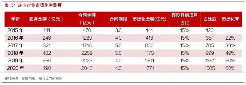 (2)環(huán)衛(wèi)市場(chǎng)化率約為60%,仍有較大的發(fā)展空間根據(jù)當(dāng)年新簽首年服務(wù)費(fèi)用與之前未到期合同年均服務(wù)金額相加得到當(dāng)年的市場(chǎng)化規(guī)模,市場(chǎng)化初期以政府購(gòu)買(mǎi)為主,合同年限一般在3年左右,2017年開(kāi)始PPP模式大規(guī)模發(fā)展,但政府購(gòu)買(mǎi)仍為主要模式,因此假設(shè)2017年之前合同平均期限逐年增加至5年。用所得市場(chǎng)化金額與前述市場(chǎng)總規(guī)模相比可得到當(dāng)年環(huán)衛(wèi)市場(chǎng)化的比例。由于前述市場(chǎng)規(guī)模測(cè)算僅包含環(huán)衛(wèi)服務(wù)中道路清掃、垃圾清運(yùn)、公廁管養(yǎng)、垃圾分類等項(xiàng)目,而當(dāng)前市場(chǎng)化項(xiàng)目中通常打包一定比例的其他項(xiàng)目,如:河道濕地管養(yǎng)維護(hù)、新建或改造公廁、中轉(zhuǎn)站改造建設(shè)與運(yùn)營(yíng)等,因此對(duì)于市場(chǎng)化測(cè)算,需要在現(xiàn)有合同金額數(shù)據(jù)上進(jìn)行一定程度的修正。即市場(chǎng)化金額除去其中包含的其他項(xiàng)目金額。