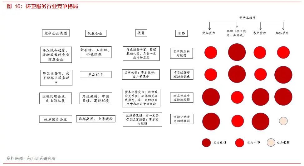 3)垃圾處理公司,向上游拓展,典型如啟迪桑德、中國(guó)天楹,政府關(guān)系、大項(xiàng)目管理能力、資本實(shí)力、異地?cái)U(kuò)張能力層面均非常強(qiáng),在品牌影響力和環(huán)衛(wèi)項(xiàng)目經(jīng)驗(yàn)上有欠缺;