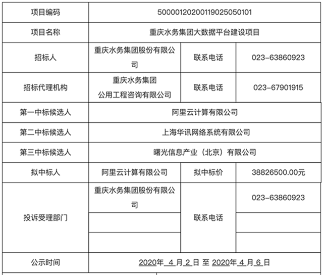 4月2日,重慶水務(wù)集團(tuán)大數(shù)據(jù)平臺建設(shè)項目發(fā)布中標(biāo)候選人公示,阿里云計算有限公司
