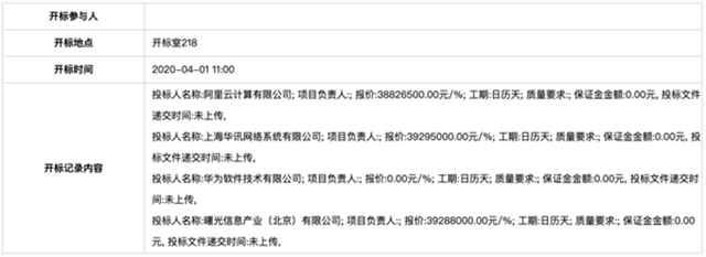投標(biāo)人:華為軟件技術(shù)有限公司報價:0.00元(云頭條經(jīng)核實,華為未繳納投標(biāo)保證金,未參與投標(biāo),所以顯示報價 0 元)