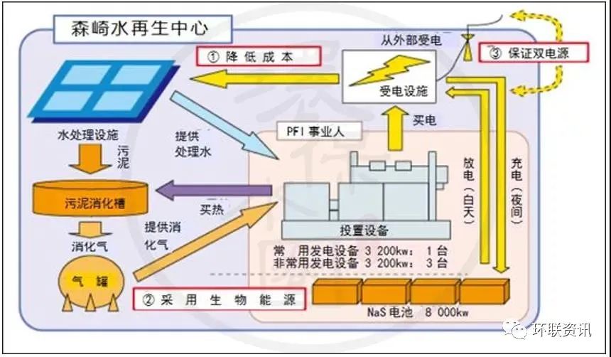 森崎水回收中心東部還設有有四個消化罐,用來從有機污泥成分中產生甲烷氣體,這將減少最終的污泥體積。每個消化罐內徑28米,深度19.5米(容積12000立方米),消化溫度約為50攝氏度。為了構建可持續(xù)發(fā)展和循環(huán)型社會,為下一代營造宜人的全球環(huán)境,森崎水回收中心正在努力利用污水處理過程中產生的能量,污泥和再生水來獲得資源和能源。夏季的廢水溫度低于夏季,冬季的溫度高于大氣溫度,“城市供熱”系統(tǒng)正是利用廢水溫差來實現區(qū)域供熱和制冷的。“城市供熱”系統(tǒng)的采用減少了化石燃料(石油,天然氣等)的使用,并有助于減少空氣污染物和電力消耗。將從水再生中心獲得的處理后的廢水供應到新的索尼公司大樓,以冷卻大樓的空調設備??照{產生的廢熱,通過熱交換器處理后被廢水吸收。該項目的環(huán)境影響是,由于冷卻設備運行所需的電力和自來水的減少,CO2排放量每年減少約22 t。此外,與將所有熱量釋放到大氣中的常規(guī)方法相比,該項目中的熱量釋放到處理后的廢水中,有助于應對熱島現象。廢水處理方法中產生的污泥在消化池中加熱,然后污泥中的有機物變成甲烷氣,減少了污泥量。過程中產生的甲烷是生物質(可再生)能源,可以被用作發(fā)電設備的燃料,每年可發(fā)電22.8 kWh。在發(fā)電設施的安裝和管理方面,森崎率先引進了PFI(私人融資計劃:是一種公私合作的方法,將資金、技術知識和管理技能從私營部門帶到公共機構),它可以降低設施建設或維護/管理的成本。它也通過可交易的綠色證書作為環(huán)境價值能源轉讓給第三方。該中心還安裝了世界上最大的NaS電池設備,用于全天的分布式電力負載:在夜間有效地使用低成本的電力,并在用電高峰期減少使用電池供電。