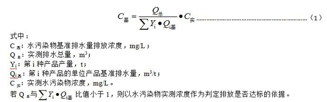 4.2.6水污染物排放濃度限值適用于單位產(chǎn)品實(shí)際排水量不高于單位產(chǎn)品基準(zhǔn)排水量的情況。若單位產(chǎn)品實(shí)際排水量超過單位產(chǎn)品基準(zhǔn)排水量,應(yīng)按公式(1)將實(shí)測水污染物濃度換算為水污染物基準(zhǔn)水量排放濃度,并以水污染物基準(zhǔn)水量排放濃度作為判定排放是否達(dá)標(biāo)的依據(jù)。產(chǎn)品產(chǎn)量和排水量統(tǒng)計(jì)周期為一個(gè)工作日。