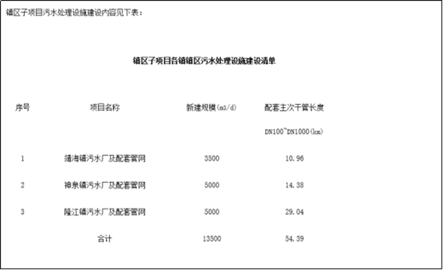 該項(xiàng)目污水處理廠及配套管網(wǎng)工程實(shí)施范圍包括靖海鎮(zhèn)、神泉鎮(zhèn)、隆江鎮(zhèn)等共3個(gè)鎮(zhèn)區(qū)范圍,污水處理工程總服務(wù)人口約9.5萬(wàn)人,新建污水處理設(shè)施總規(guī)模為1.35萬(wàn)m3/d,新建配套污水收集主次干管(DN100~DN1000)總長(zhǎng)約54.4公里,設(shè)置3個(gè)一體化預(yù)制泵站。具體如下: