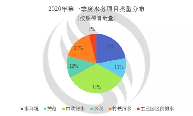 一季度水務(wù)市場整體概況:市政污水項(xiàng)目數(shù)量最多,占比整個(gè)水務(wù)市場超三成;水環(huán)境項(xiàng)目投資額占比最大,占比整個(gè)水務(wù)市場的近一半。(3)