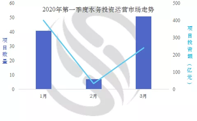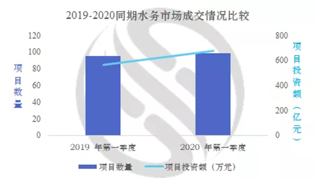 一季度水務(wù)市場走勢:2月受疫情影響觸底,3月反彈。項(xiàng)目成交數(shù)量與去年同期相比基本持平,成交投資額甚至有所增加,增加了20%。(4)