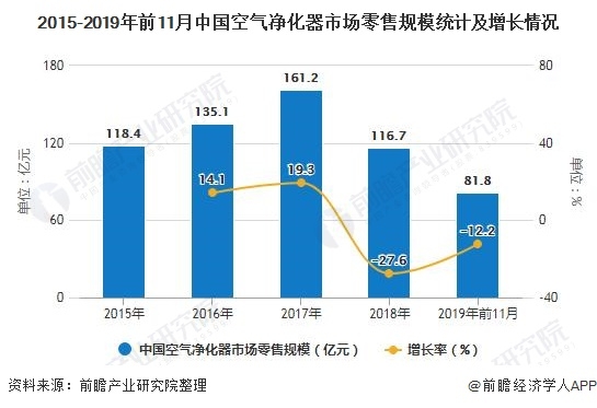 霧霾是空氣凈化器爆發(fā)的催化劑,卻也讓空凈市場滑入悲哀之境。當(dāng)大氣治理工作展開后,空氣質(zhì)量的明顯好轉(zhuǎn)也致使空氣凈化器市場發(fā)展開始“掉頭”。2018年空氣凈化器市場還是下滑,這一趨勢在2019年仍未得到改善。根據(jù)奧維云網(wǎng)公布的監(jiān)測數(shù)據(jù)顯示,2018年我國空氣凈化器零售額為116.7億元,大幅下降,同比下降27.6%,截至2019年11月,我國空氣凈化器零售總額為81.8億元,同比下降12.2%。