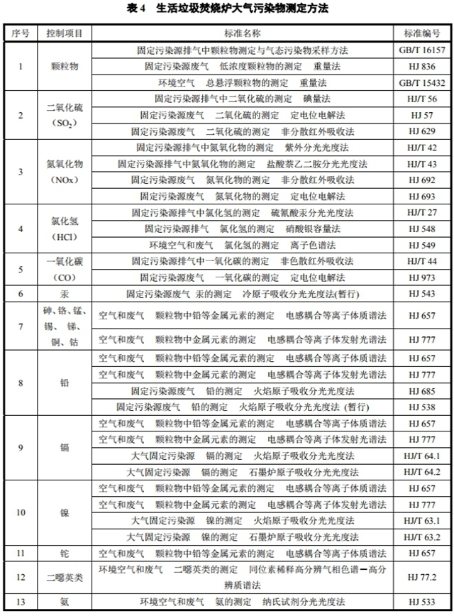 9.10 焚燒爐大氣污染物的測(cè)定方法采用表4所列的方法標(biāo)準(zhǔn)。本標(biāo)準(zhǔn)實(shí)施后國家發(fā)布的污染物監(jiān)測(cè)方法標(biāo)準(zhǔn),如適用性滿足要求,同樣適用于本標(biāo)準(zhǔn)相應(yīng)污染物的測(cè)定。